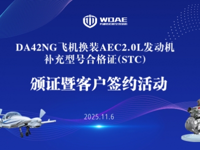 2025年11月6日,芜湖钻石航空发动机有限公司(以下简称芜湖钻石航发)在安徽芜湖隆重举行AEC2.0L航空发动机DA42NG补充型号合格证(STC)颁证暨客户
